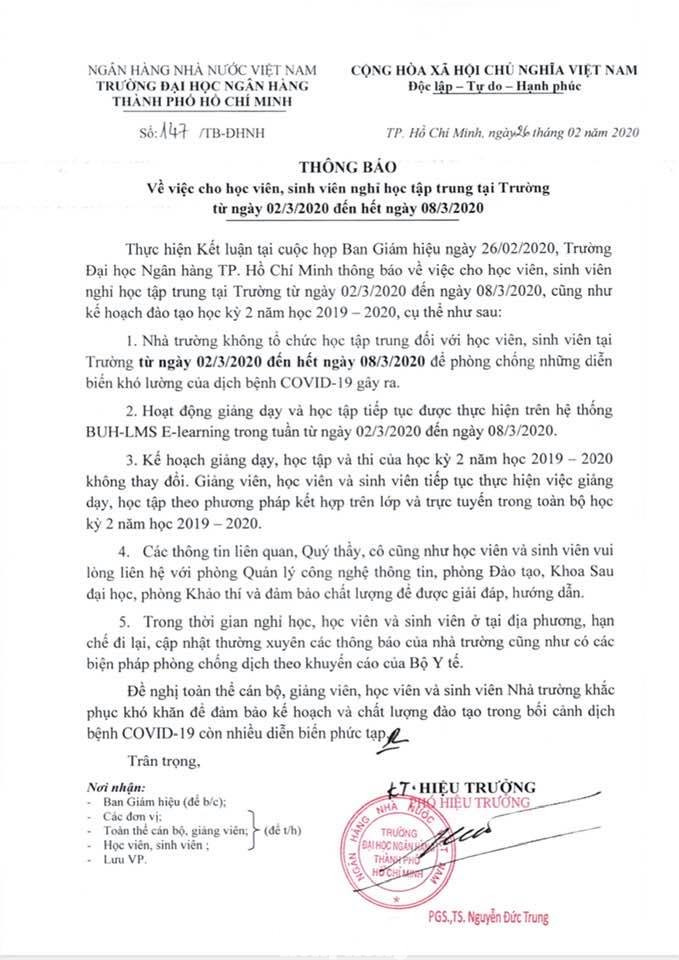 Trong khi đó, Trường ĐH Ngân hàng TPHCM ra tiếp tục ra thông báo đến sinh viên của trường về việc “Không học tập trung, tiếp tục triển khai E-Learning đến hết ngày 8/3/2020 và theo dõi diễn biến của dịch bệnh”.