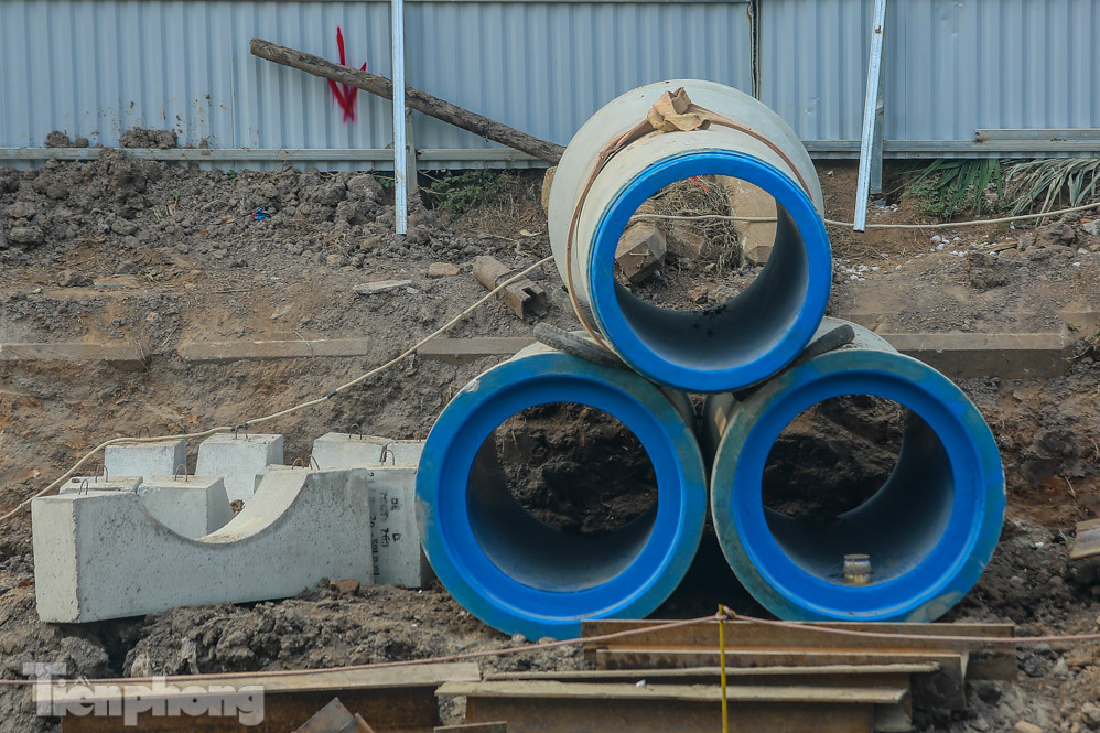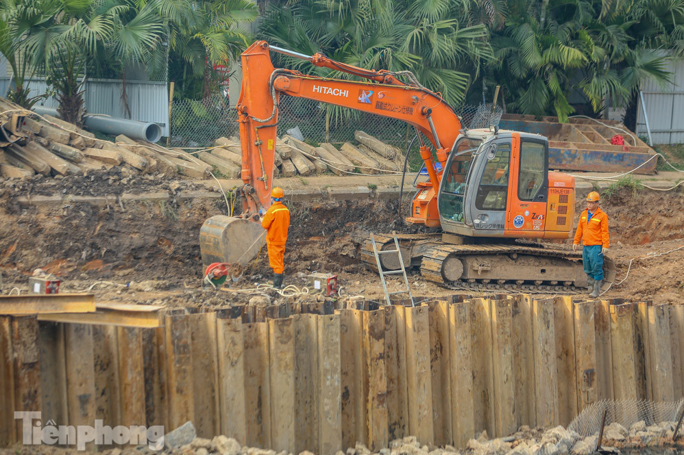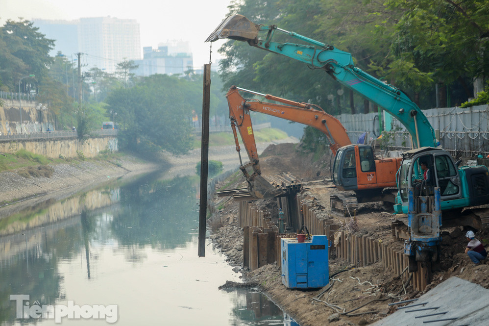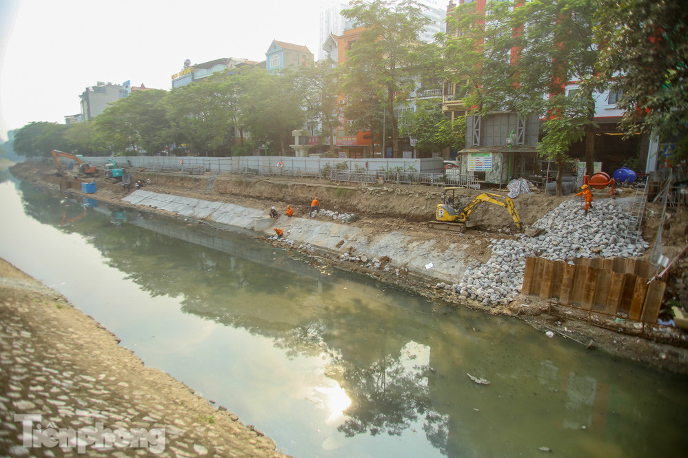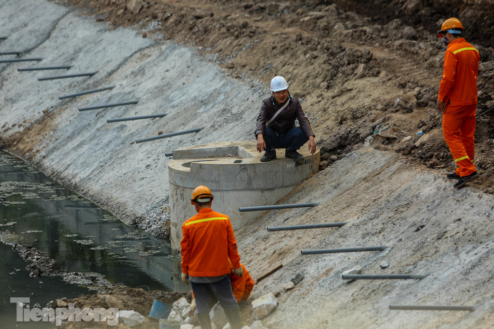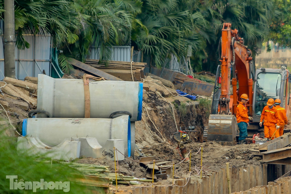 Tại bờ kè sông Tô Lịch, đoạn giáp với đường Hoàng Quốc Việt (Cầu Giấy, Hà Nội), hàng chục công nhân đang thi công chôn ống và làm kè bê tông trong dự án xây dựng hệ thống cống thu gom nước thải bao quanh sông Tô Lịch.
