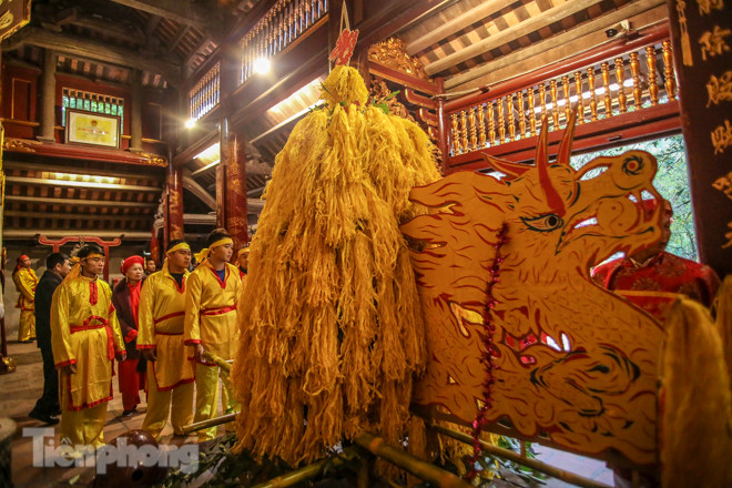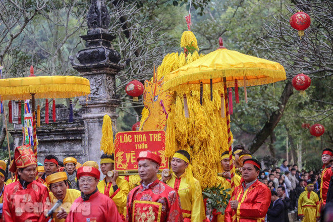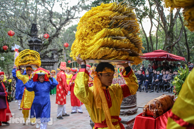 Nghi lễ dâng hoa tre lên đền Thượng của thôn Vệ Linh (xã Phù Linh) được tổ chức đầu tiên