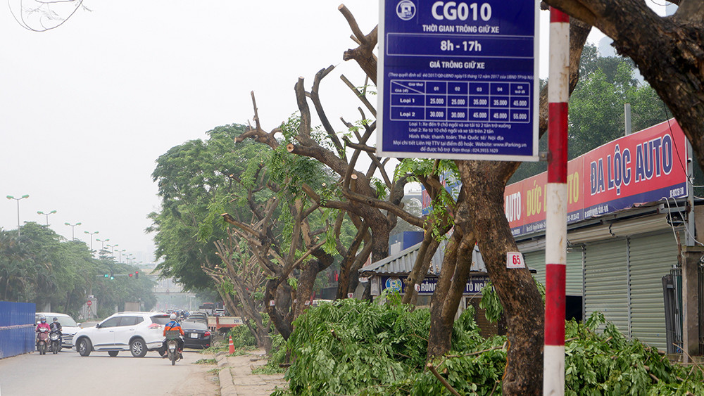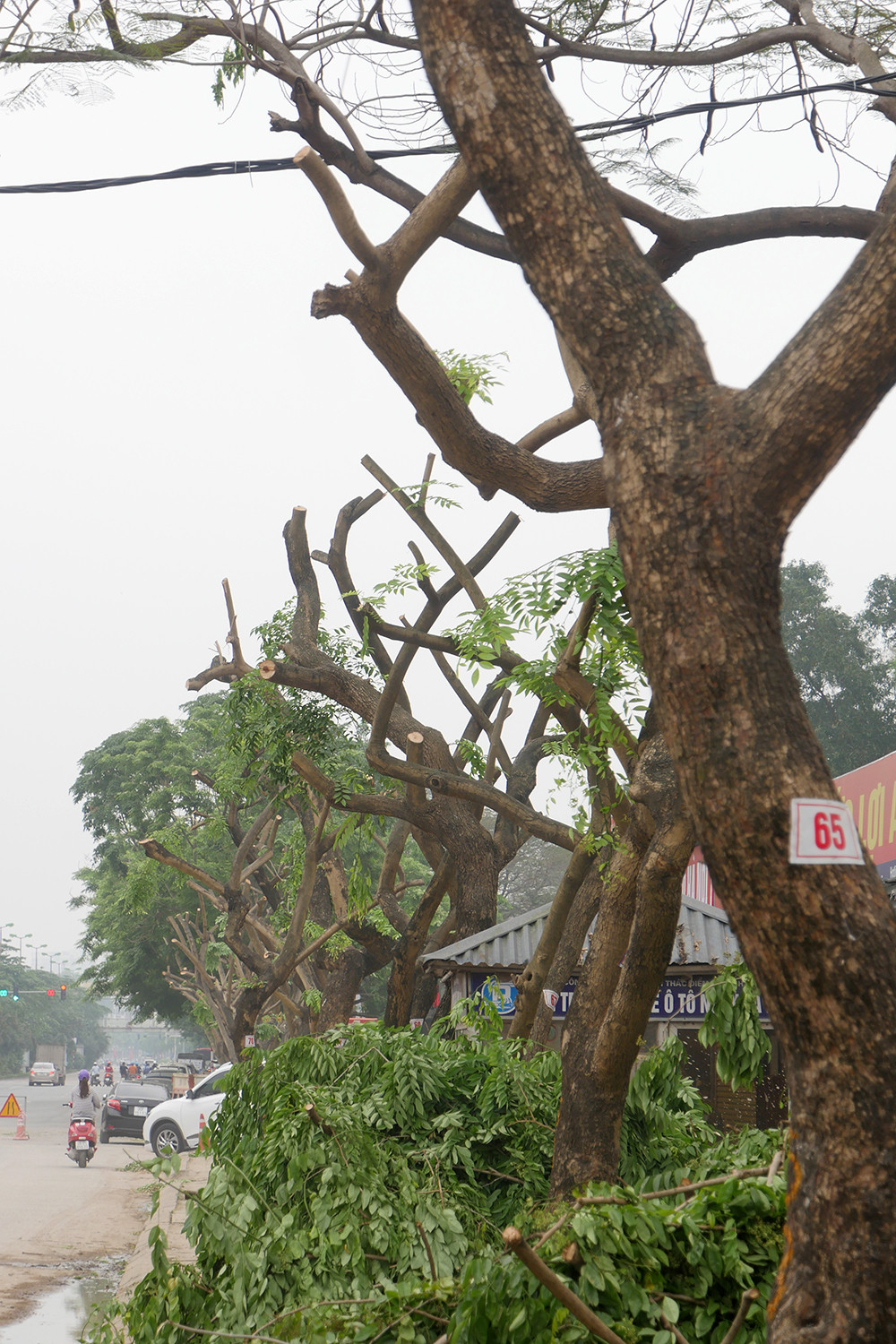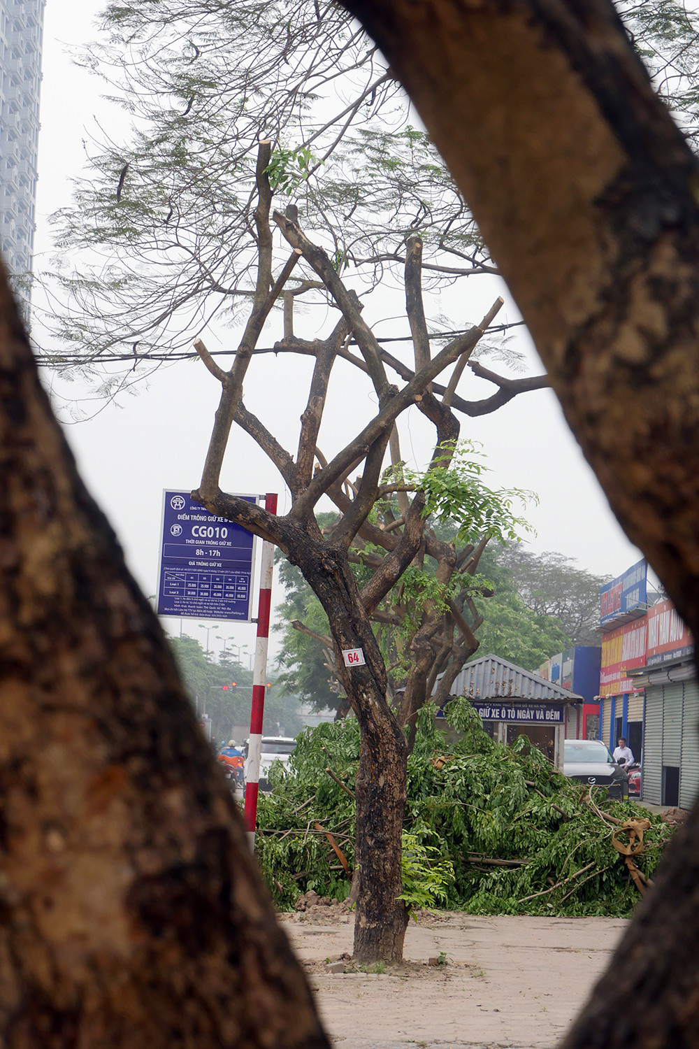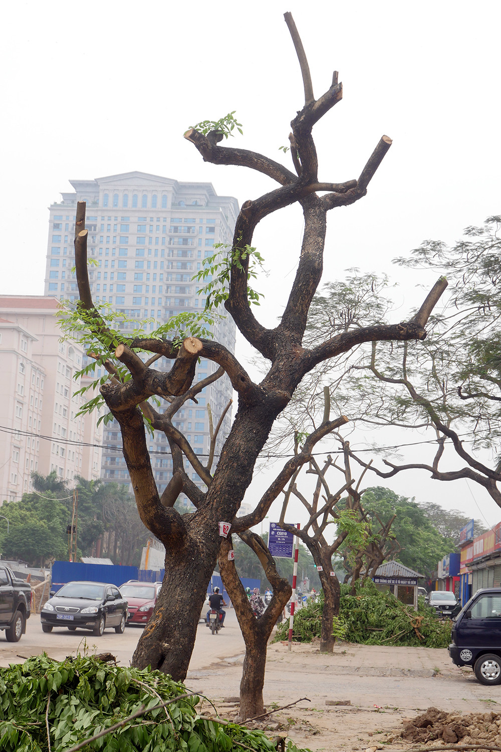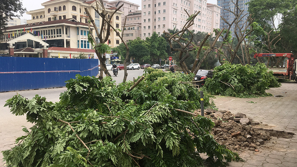Sáng 21/4, hàng loạt cây sưa đỏ tại ngã tư Hoàng Quốc Việt - Nguyễn Văn Huyên (Cầu Giấy) được cắt tỉa, đánh chuyển.