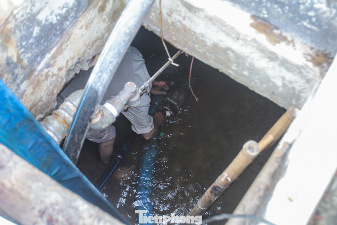 Công nhân lắp đặt máy bơm, hút nước từ dưới bể lên.