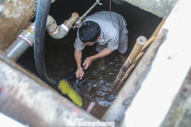 Khoảng hơn 30 nhân công công ty Viwaco thực hiện công tác thau dọn bể cho các toà chung cư cũng như súc xả hệ thống đường ống, bể chứa do Cty này quản lý.