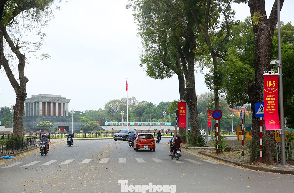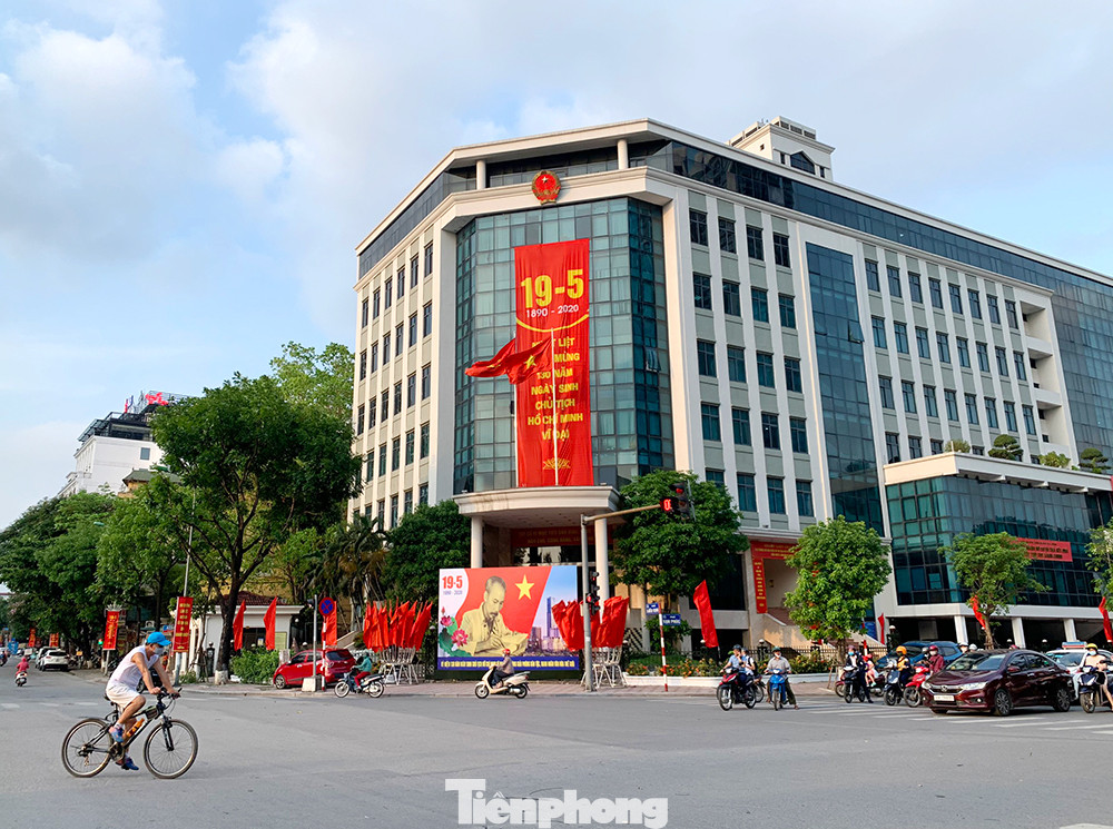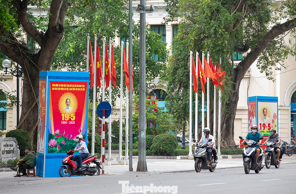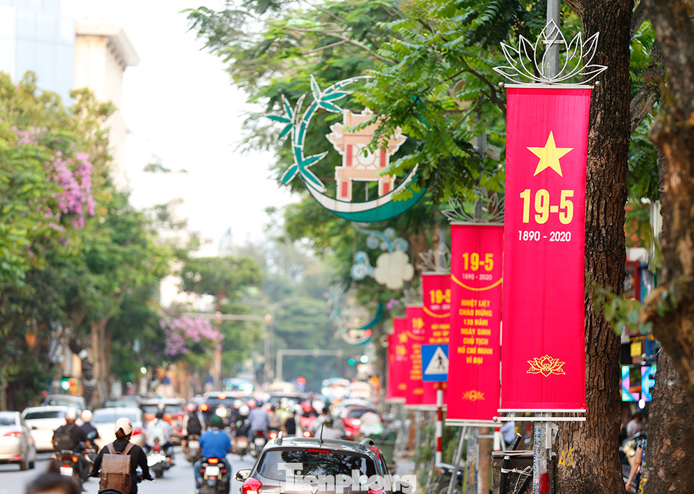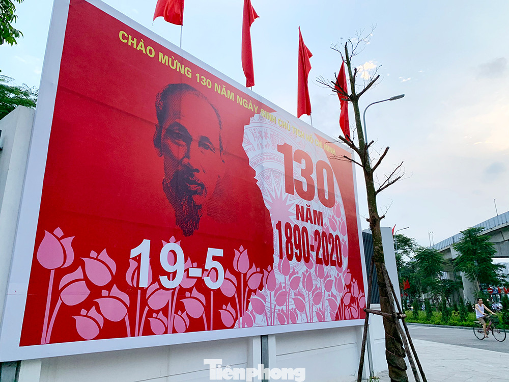 Cờ Tổ quốc, biểu ngữ, băng rôn, tranh cổ động… được treo ở nhiều tuyến phố tại Hà Nội để kỷ niệm 130 năm Ngày sinh Chủ tịch Hồ Chí Minh