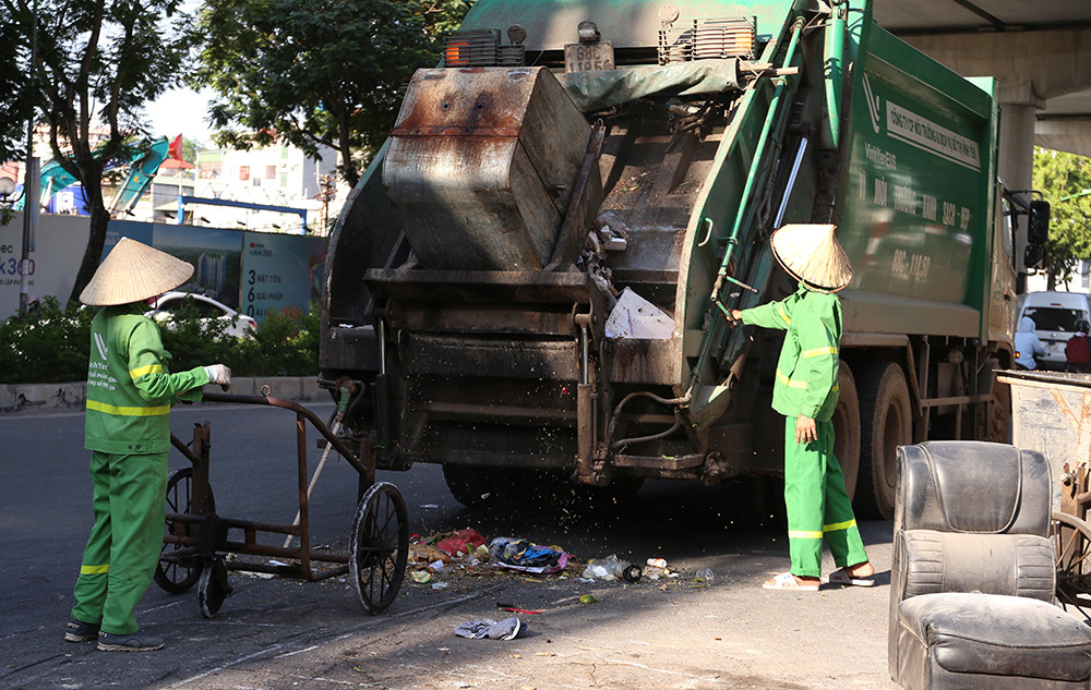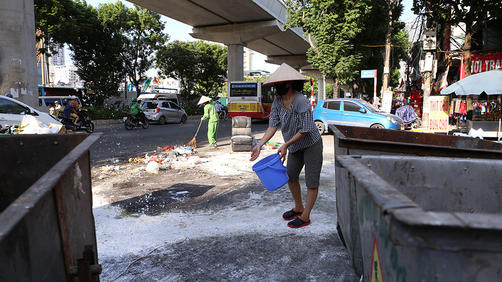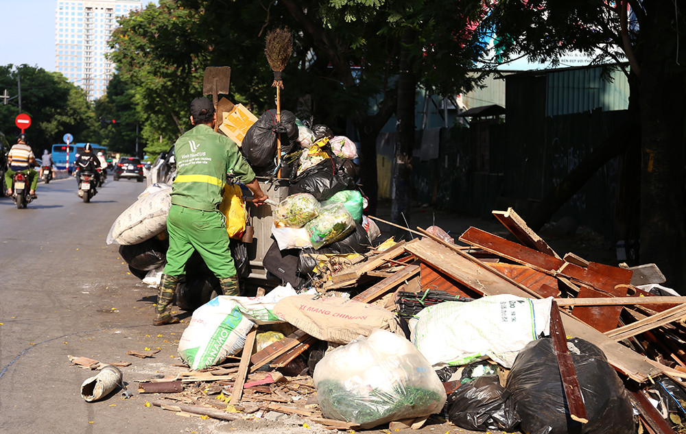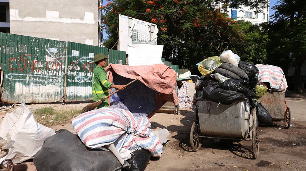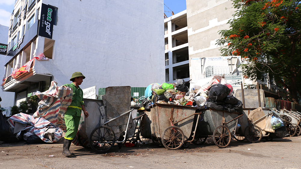 Những công nhân môi trường đang vật lộn với những xe rác cao hơn cả người ở đường Láng.