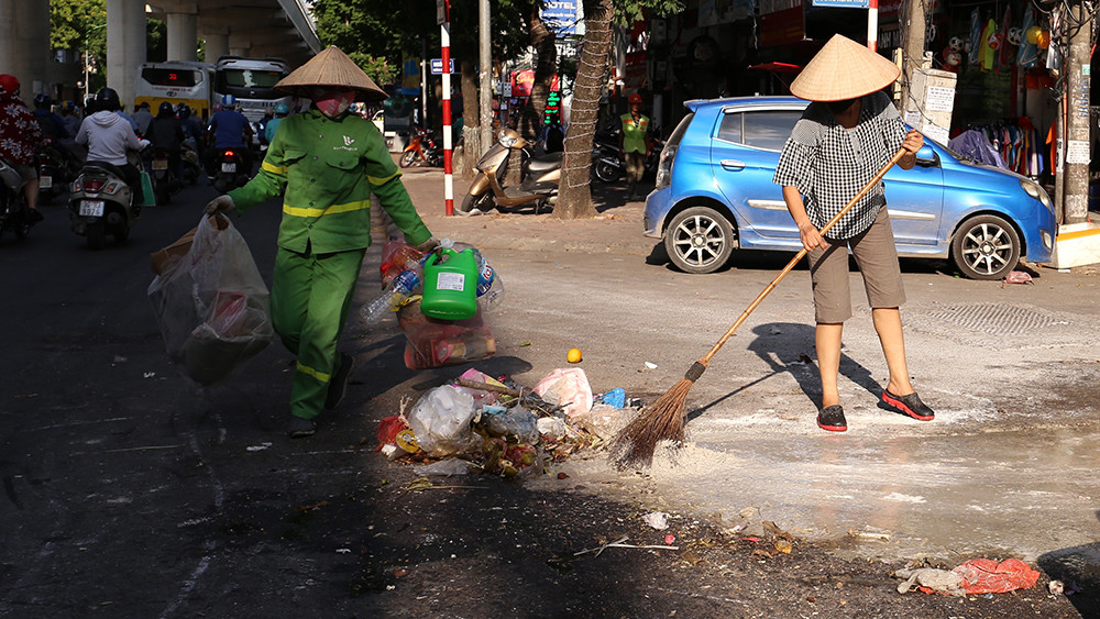 Thu gom rác thải ngay tại đường Xuân Thủy.
