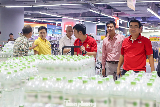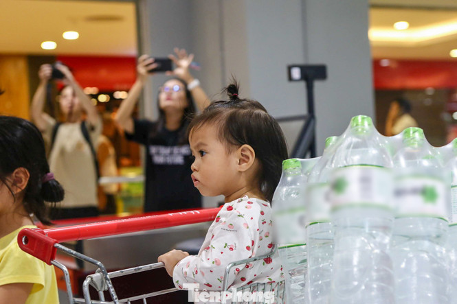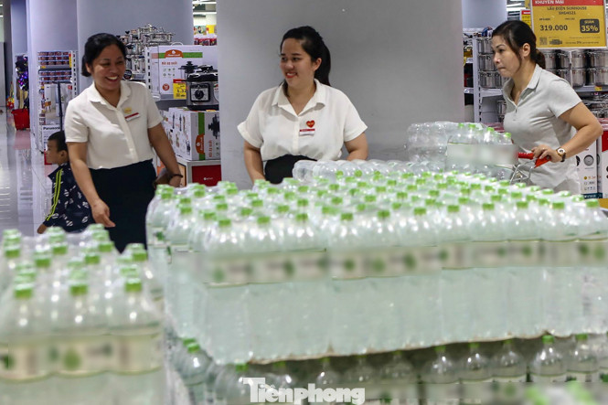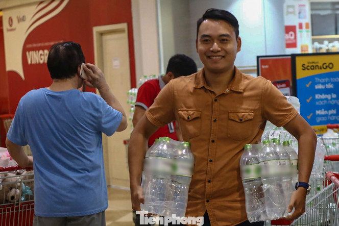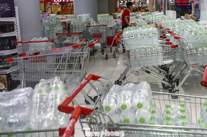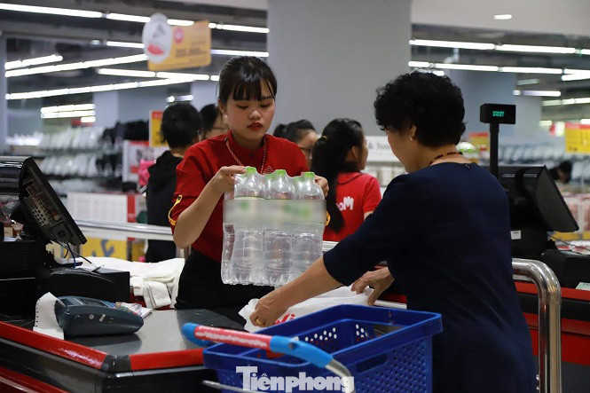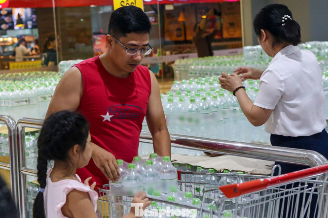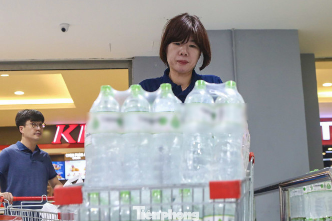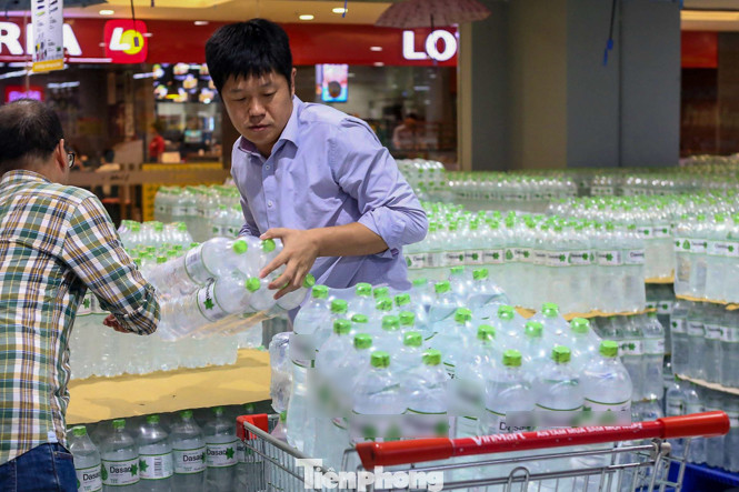 Sau khi thông báo tạm thời cắt nước, trong ngày hôm qua và hôm nay, các siêu thị và cửa hàng tại quận Hoàng Mai, Thanh Xuân... rất nhiều người dân kéo đến mua nước đóng chai với số lượng lớn.