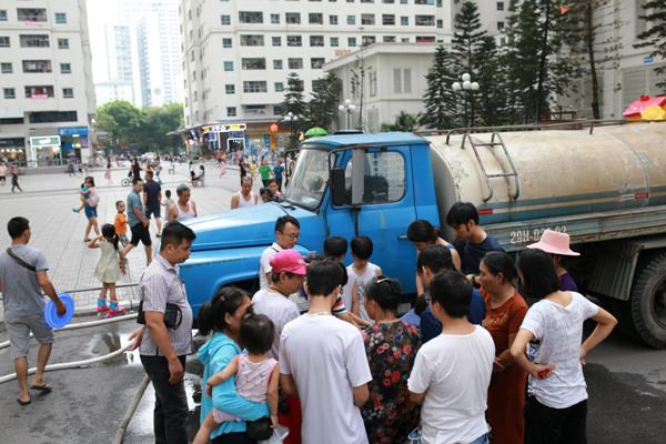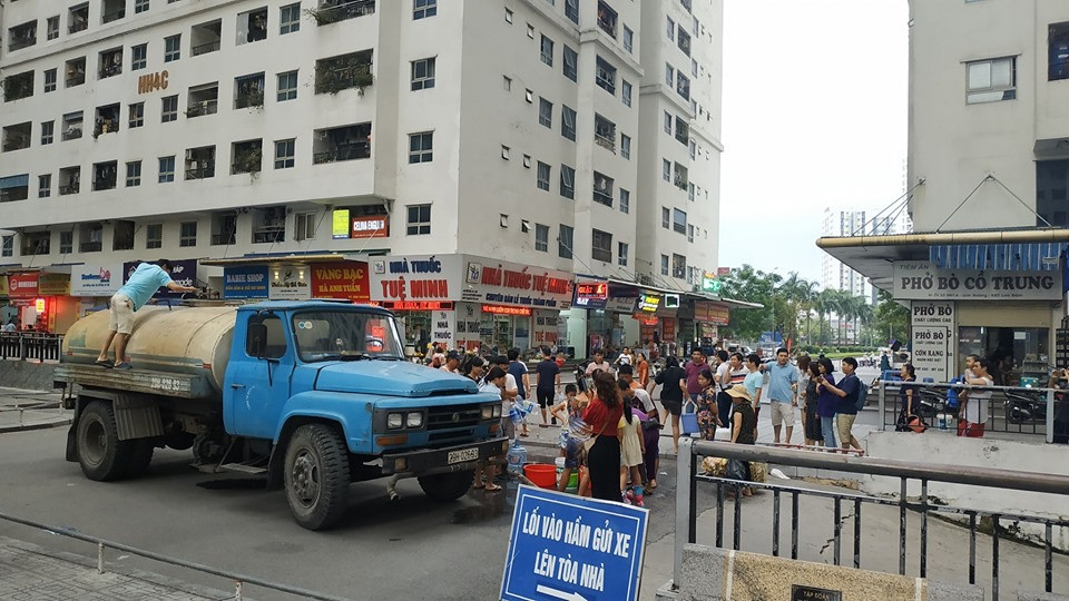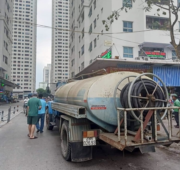 Do mua nước lọc đóng bình không đủ để sinh hoạt và nhiều cửa hàng cũng “cháy hàng” nên chiều qua người dân tại các tòa nhà HH Linh Đàm đã nhờ đại diện tòa nhà gọi xe téc chở nước sạch dịch vụ đến cung cấp cho bà con.