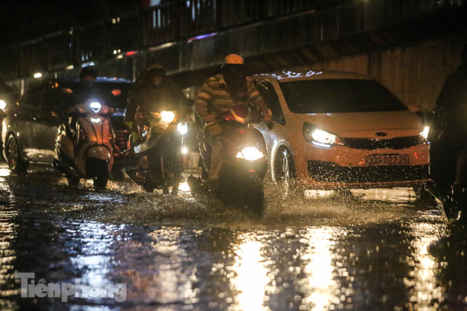 Tại phố Láng Hạ, tuyến phố thường xuyên ùn tắc lúc giờ cao điểm tại quận Đống Đa (Hà Nội) chịu cảnh tương tự sau cơn mưa.