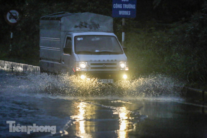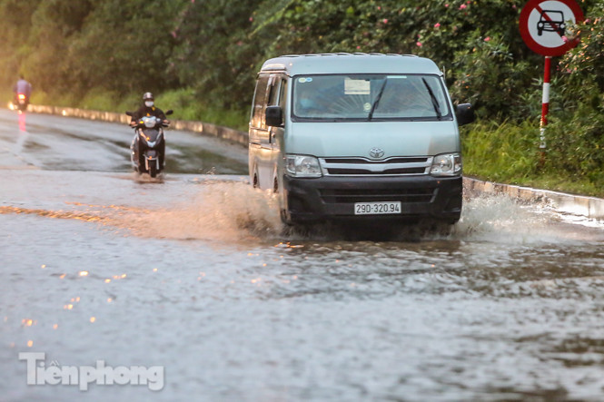 Ghi nhận trên đường Đại lộ Thăng Long, nhiều đoạn thuộc huyện Quốc Oai, huyện Hoài Đức ngập úng.