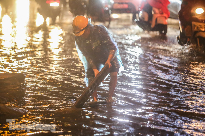 Công nhân xuất hiện "giải cứu" ngập úng trên tuyến phố.