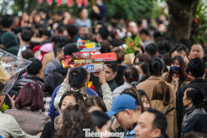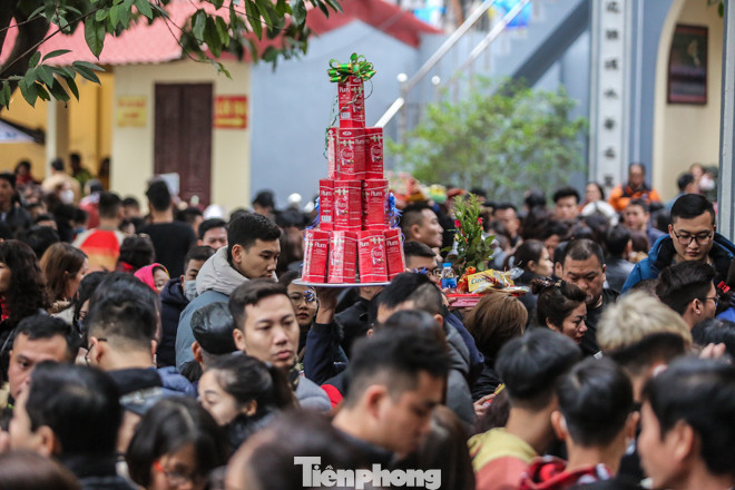 Tránh va chạm với người xung quanh, du khách hành hương bắt buộc phải nâng mâm lễ lên cao hoặc đội lên đầu.