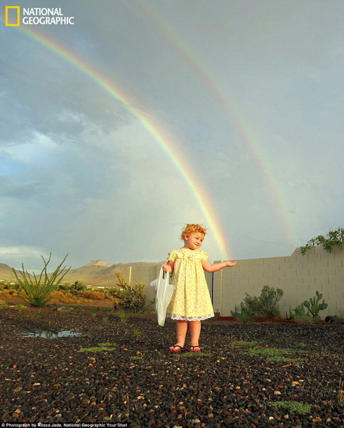 Bé gái đứng dưới cầu vồng đôi sau một trận bão ở sa mạc Arizona