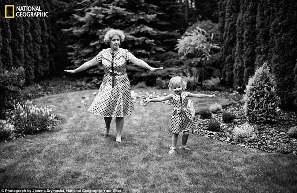 Bé gái Maja bắt chước bà khiêu vũ trên bãi cỏ