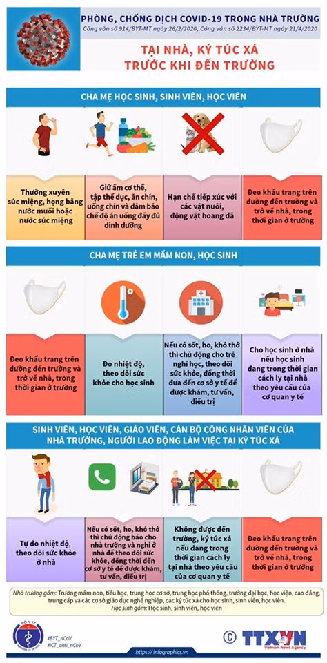 TPO - Học sinh chủ yếu lớp 9 và 12 của gần 30 tỉnh, thành đã trở lại trường sau thời gian dài nghỉ học phòng dịch COVID-19. Các cấp lớp còn lại dự kiến đến trường các tuần sau đó. Để phòng chống lây nhiễm căn bệnh nguy hiểm này, Bộ Y tế đã đưa ra khuyến cáo những việc cần phải thực hiện trong trường học.
