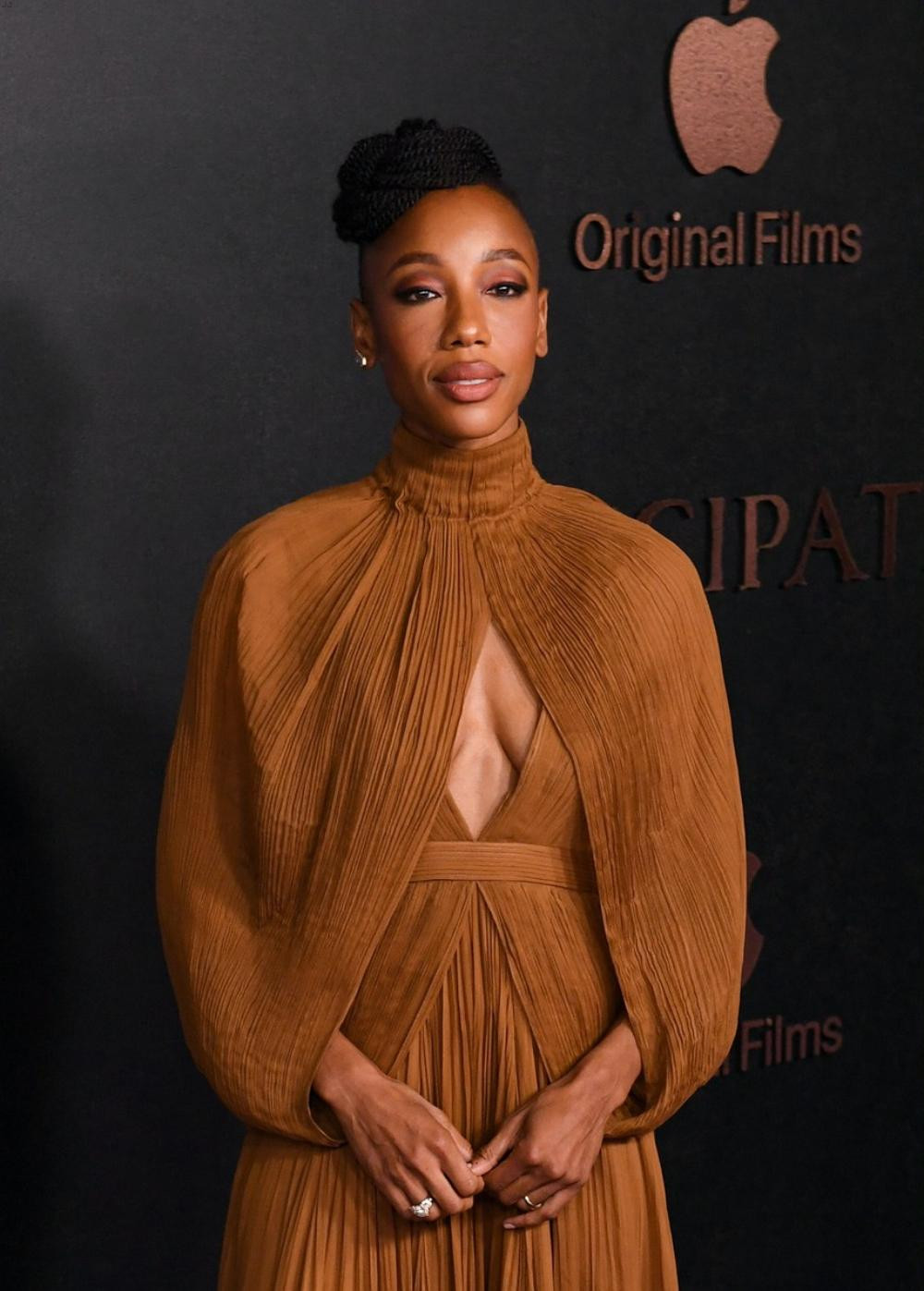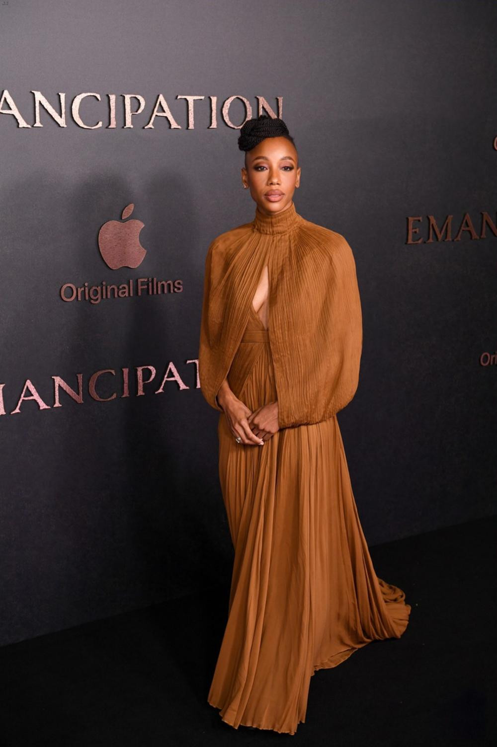 Nữ diễn viên người Úc Charmaine Bingwa khoe vẻ nữ tính trên thảm đỏ buổi công chiếu Emancipation cùng tài tử Will Smith và các cộng sự tại London. Mẫu đầm được trau chuốt trên nền vải chiffon dập ly với điểm nhấn choàng áo. Chi tiết cut-out ở phần ngực tạo nét đẹp thanh lịch mà quyến rũ.