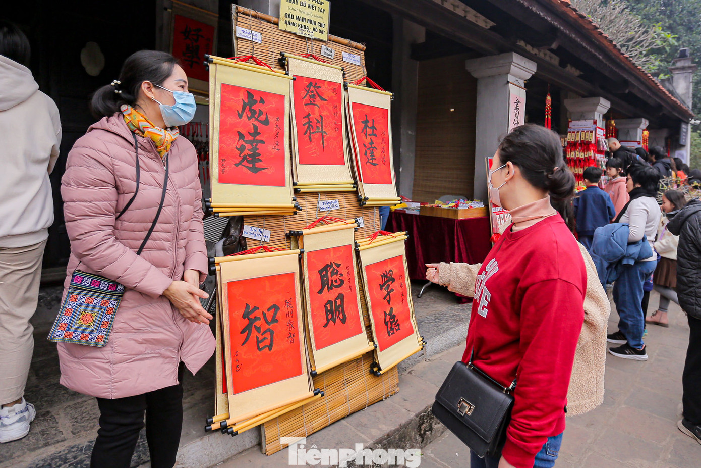 | Bên trong Văn Miếu, các gian hàng đồ lưu niệm, bán chữ hút khách tham quan. |