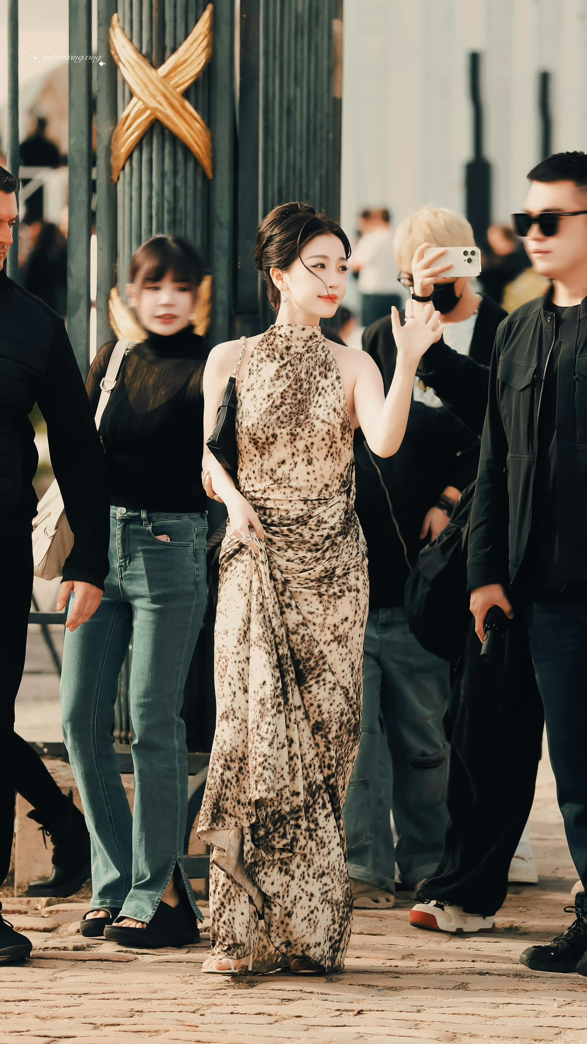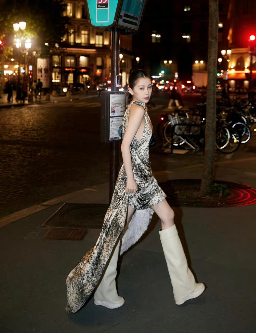 Nữ chính Vân Chi Vũ diện váy da báo, kết hợp cùng kính râm, túi xách đen và boots cao cổ màu da.