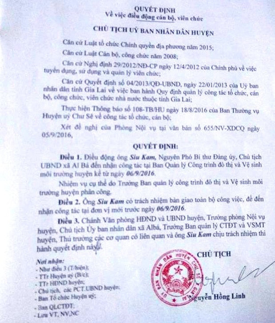 Ngày 10/9, nguồn tin từ UBND huyện Đức Cơ, tỉnh Gia Lai, cho biết đã có quyết định điều chuyển công tác đối với ông Siu Kam, nguyên Phó bí thư Đảng ủy, Chủ tịch UBND xã Albá (huyện ĐứcCơ) về công tác tại Ban quản lý Công trình đô thị và Vệ sinh môi trường huyện từ ngày 6/9. Nhiệm vụ cụ thể của ông Siu Kam sẽ do trưởng Ban này phân công.