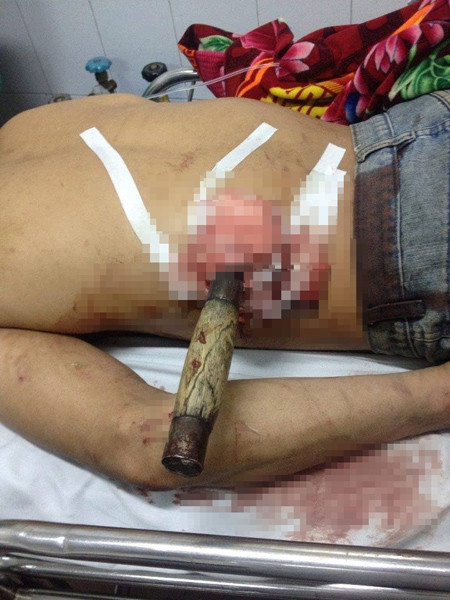 Nạn nhân được chuyển đến Bệnh viện Việt Đức trong tình trạng con dao có lưỡi dài khoảng 30 cm cắm từ mạng sườn trái ngập sâu vào phần ngang bụng. Ngay sau khi làm các thủ tục cần thiết bệnh nhân đã được chuyển mổ cấp cứu.