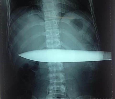 Hình ảnh phim chụp X-quang chưa thể đánh giá hết được tổn thương vùng bụng, tuy nhiên tình trạng sức khỏe của bệnh nhân khá nguy kịch. Bệnh nhân T. ngay sau đó đã được chuyển vào phòng mổ cấp cứu để rút dao ra khỏi cơ thể.