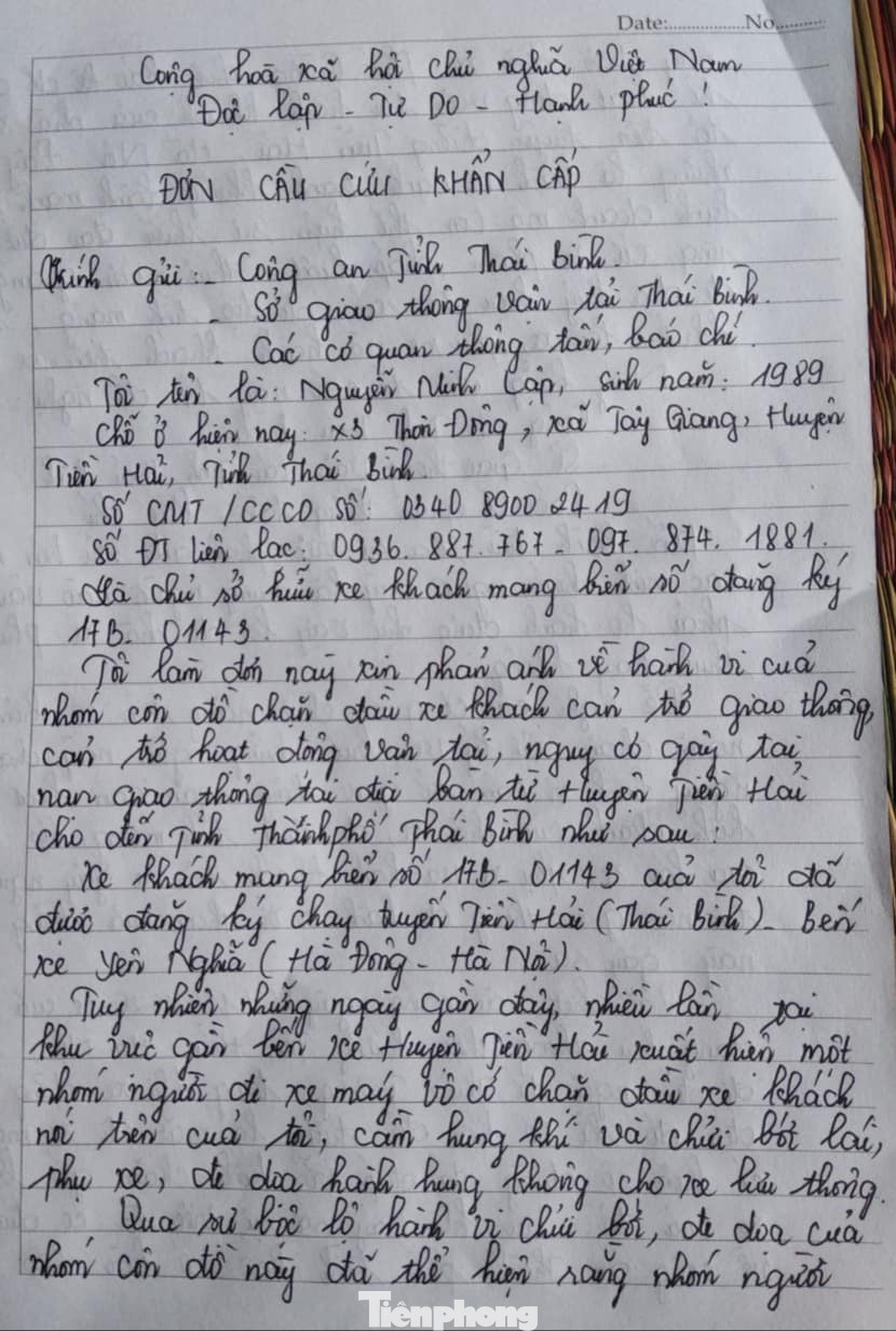 Liên quan đến vụ việc, trước đó, ông Nguyễn Minh Lập (31 tuổi, trú tại thôn Đông, xã Tây Giang, huyện Tiền Hải, tỉnh Thái Bình, là chủ xe khách 29 chỗ mang BS 17B - 011.43 chạy tuyến cố định Tiền Hải, Thái Bình - Yên Nghĩa, Hà Nội) đã viết đơn tố cáo gửi các cơ quan chức năng.