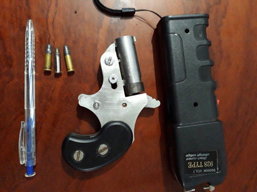 Khẩu súng, roi điện cảnh sát thu giữ. Ảnh: C.A.