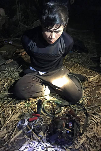 Với sự giúp đỡ của người dân, nhà chức trách bắt được Lê Hồng Quyết (42 tuổi, trú huyện Lệ Thủy, Quảng Bình) cùng một bình xịt hơi cay, đèn pin, một chai ớt bột, bảy vòng dây thép, một ná cao su.