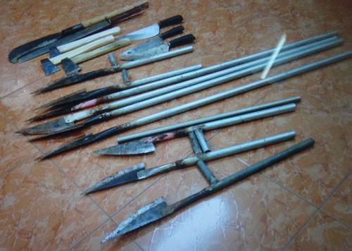 Tang vật thu giữ gồm 21 ĐTDĐ, 8 cuốn sổ ghi chép liên quan đến cho vay nặng lãi, 3 cái rìu, 3 dao bầu, 1 dao rựa, 1 mã tấu, 10 típ sắt dài có gắn dao ở đầu sắc nhọn và một xe ô tô du lịch biển số Hà Nội.