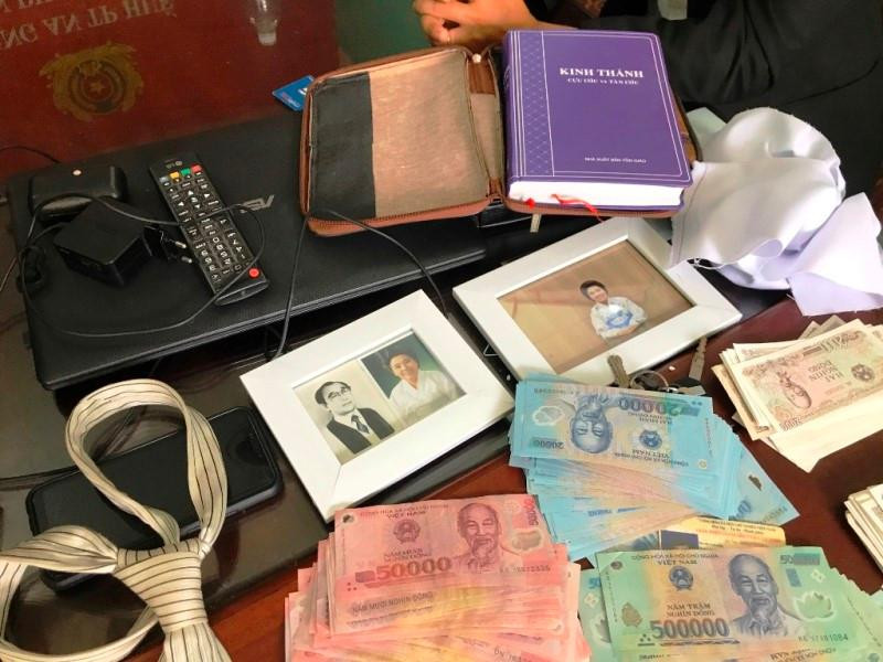 Tại thời điểm kiểm tra, công an đã phát hiện và thu giữ 3 quyển kinh thánh, khoảng 200 bì thư đựng tiền dâng lễ với tổng số tiền hơn 66 triệu đồng cùng nhiều phương tiện, máy móc khác.