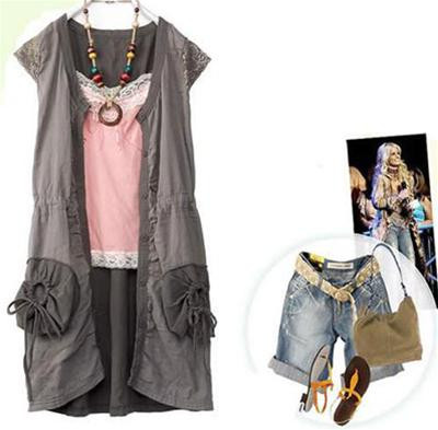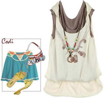 Áo hai lớp dài, thắt dưới hông màu ghi-trắng kết hợp với váy ngắn màu tươi sáng như xanh, hồng hoặc vàng. Tạo điểm nhấn bằng túi xách nhỏ nhiều màu và guốc đính hoa.