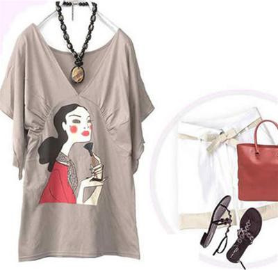 Áo kiểu “cánh dơi”, cổ khoét sâu mặc cùng quần soóc. Vòng cổ có dây và mặt đá to, sandal quai mảnh.