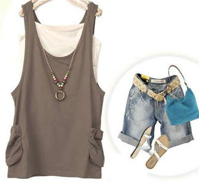 Áo ba lỗ biến tấu dài và rộng, kết hợp với quần soóc bò tạo dáng khỏe mạnh. Phụ kiện có thể là túi xách quai dài.