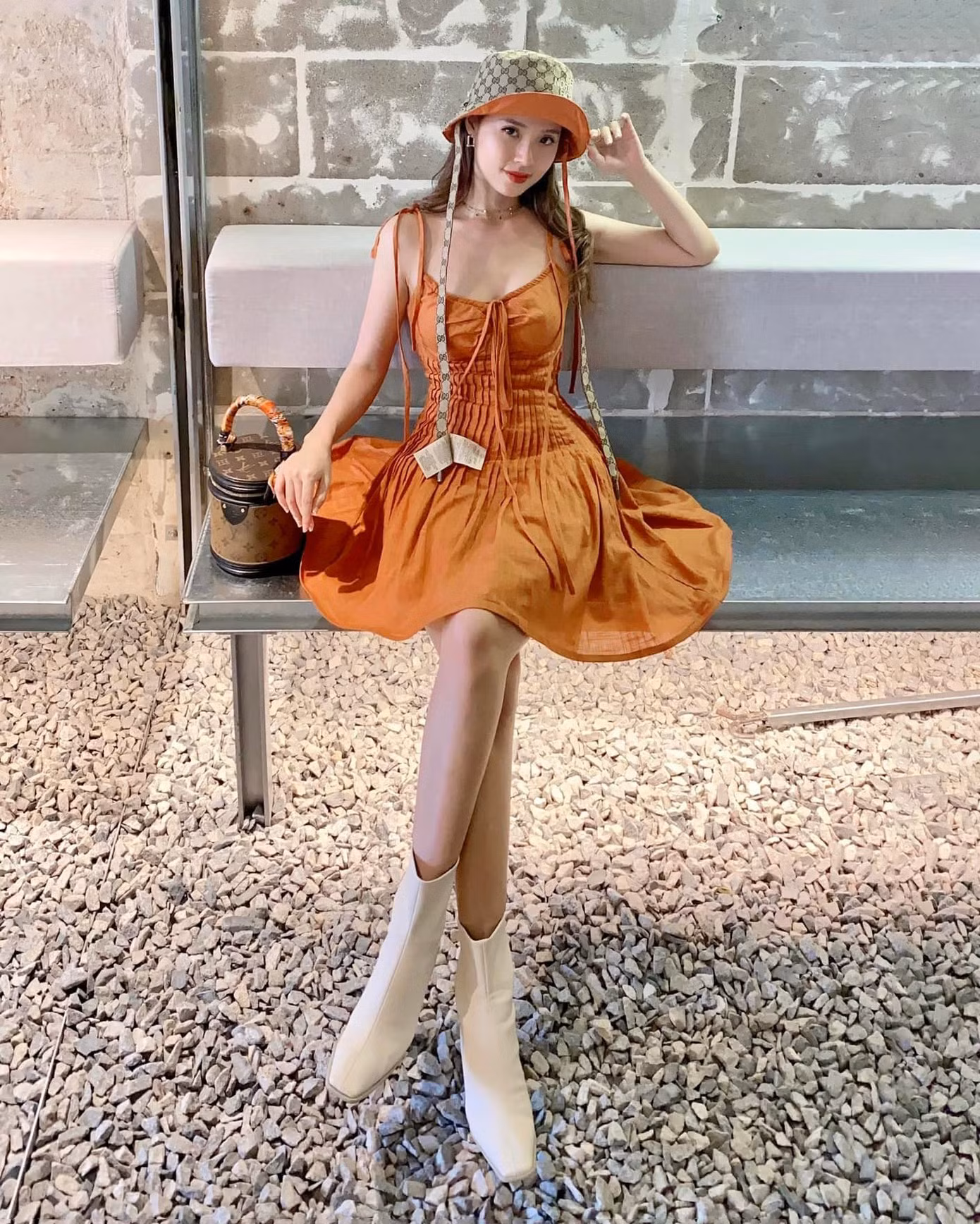 Sở hữu vóc dáng mảnh mai, nữ diễn viên chuộng các thiết kế khoe khéo bờ vai thanh mảnh. Cùng chồng dùng bữa, uống trà chiều, cô nổi bật trong thiết kế đầm hai dây tông màu cam đất. Midu cũng từng diện mẫu đầm này trong nhiều lần gặp gỡ bạn bè. So với thời điểm này, nhan sắc nàng dâu hào môn trông mặn mà, cuốn hút.