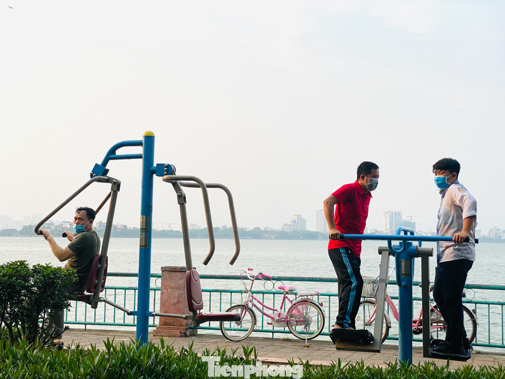 Các khu luyện tập thể thao quanh hồ chật kín người trong buổi chiều oi ả.