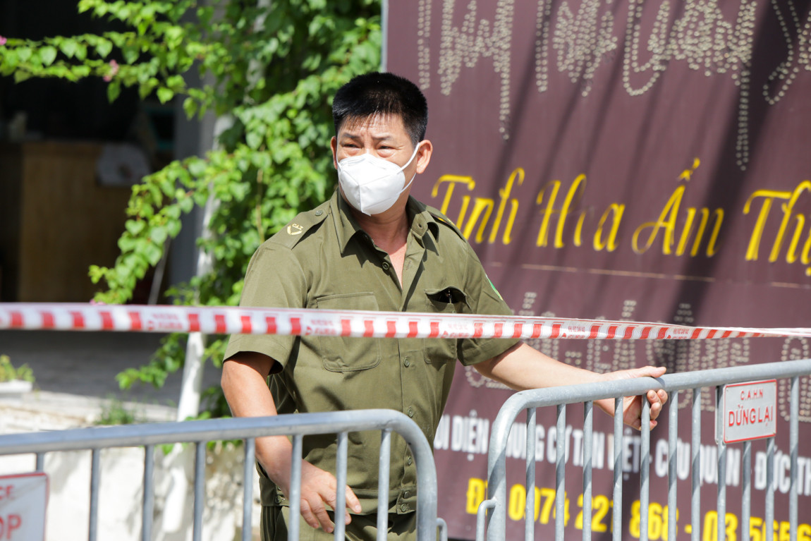 Lều dã chiến của lực lượng chức năng được triển khai ngay trước lối vào khu chung cư.