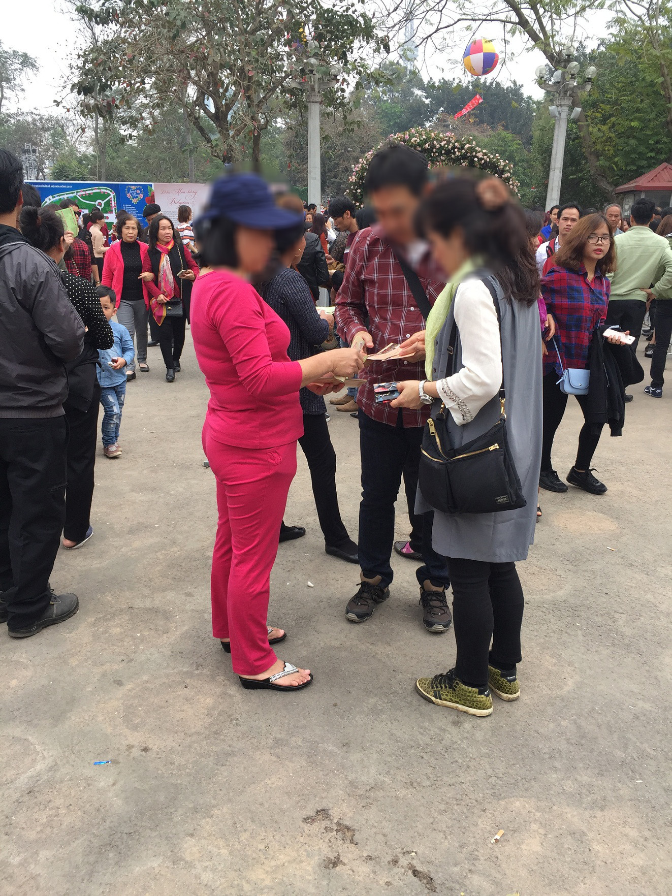 Những đầu mối vé “chợ đen” ngang nhiên giao dịch tại lễ hội hoa. (Ảnh: Hưng Nguyễn)