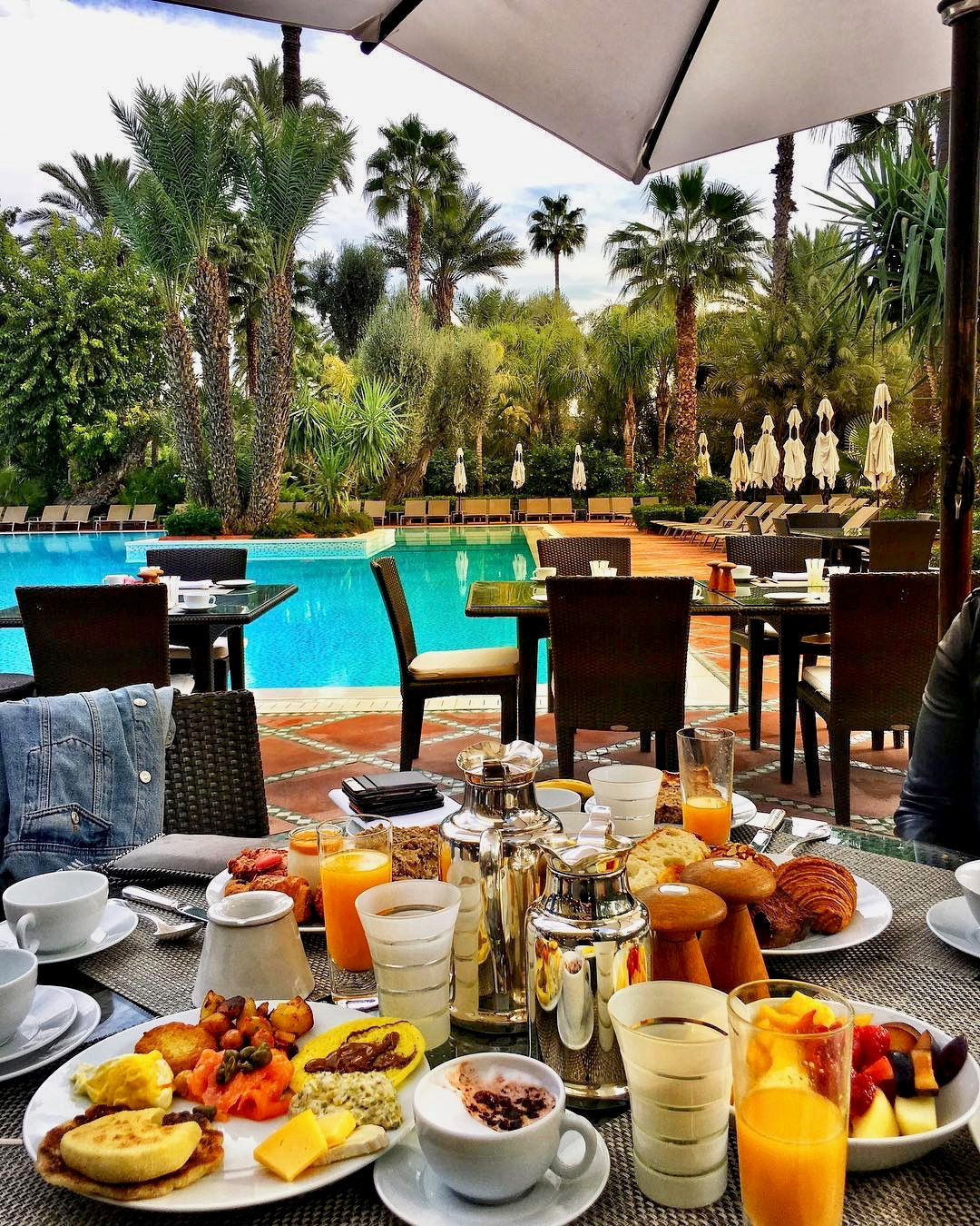 Bữa sáng ở La Mamounia được phục vụ tự chọn tại nhà hàng bên hồ bơi luôn phong phú và nóng hổi khi tới tay thực khách.