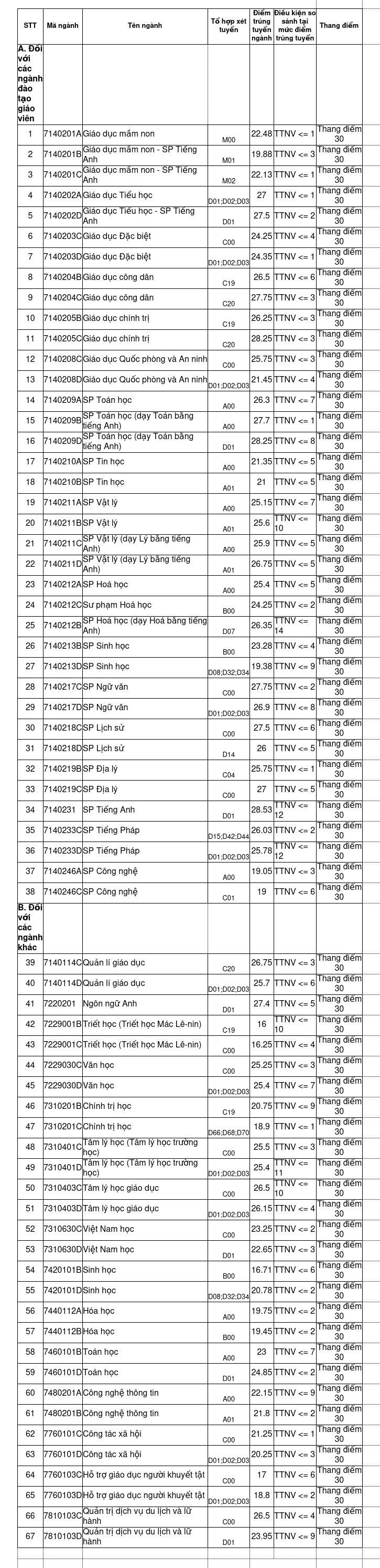 Điểm chuẩn cụ thể các ngành của trường ĐH Sư phạm Hà Nội như sau: