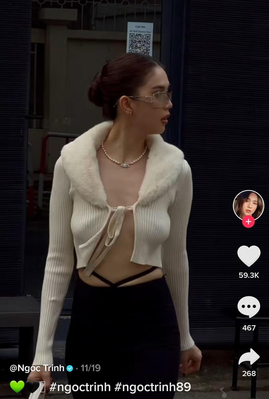 Cách đây vài ngày, Ngọc Trinh lộ video đang đi dạo trên phố, chỉ mặc một chiếc áo lửng buộc hững hờ khoe vòng 1 không nội y. Chính vì 'thả rông' như thế nên Ngọc Trinh bị lộ vòng 1 có phần 'xuống cấp', không được căng tròn, nóng bỏng như những bức ảnh đã qua chỉnh sửa.