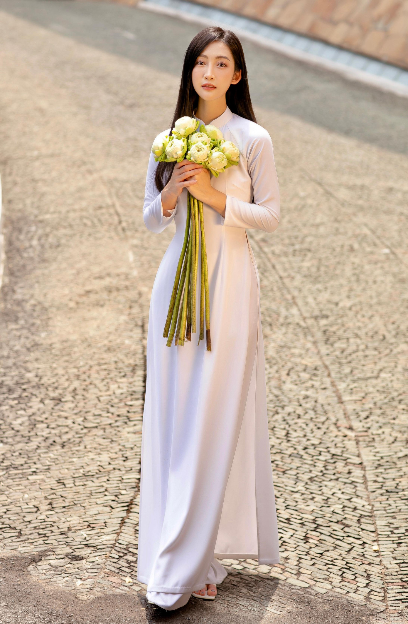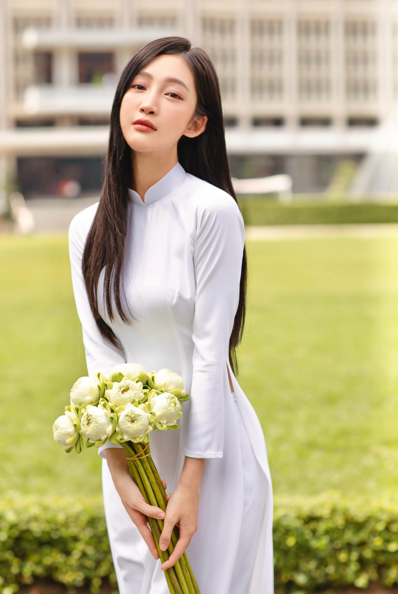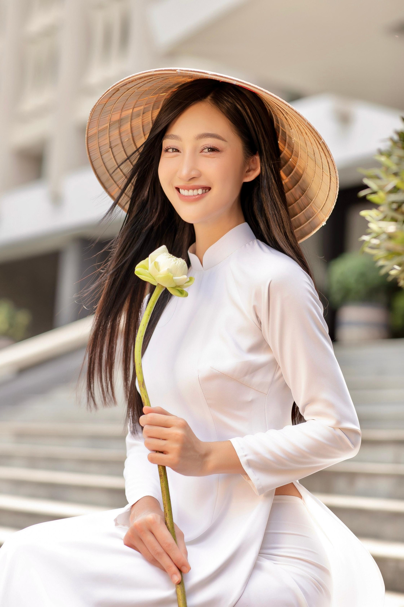 Chỉ sử dụng thêm một chiếc nón lá và những đoá hoa sen trắng, Juky San mong muốn thể hiện nét đẹp dịu dàng, nền nã và thanh thuần nhất của một người con gái Việt Nam. Không cần khoác lên những phụ kiện lấp lánh, cô gái Việt Nam vẫn nổi bật trong tà áo dài truyền thống vốn đã trở thành niềm tự hào của dân tộc.