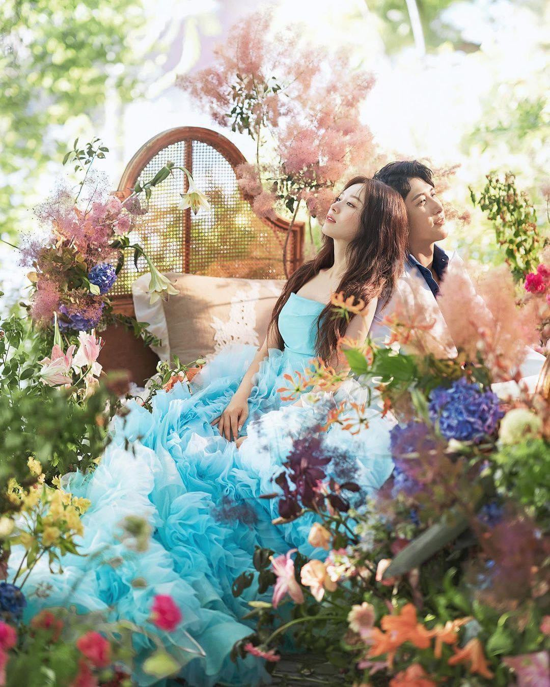 Dù là lúc diện váy trắng truyền thống, cặp đôi cũng làm mới bộ ảnh của mình với phụ kiện kính râm. Có thể thấy, "gu" của Jiyeon là những chiếc váy bồng xoè nhiều tầng và khoe được đôi vai thon thả của cô.