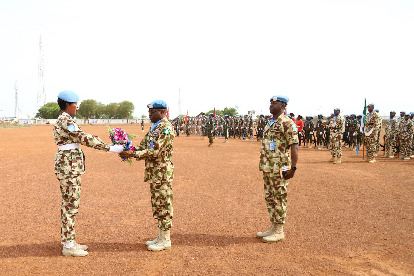 Phát biểu tại buổi lễ, Thiếu tướng Benjamin Olufemi Sawyerr - Quyền trưởng Phái bộ, Tư lệnh quân sự nhấn mạnh: Chủ đề của năm nay là “Hòa bình bắt đầu từ tôi”. Tôi muốn mỗi người chúng ta ghi nhớ điều này để tiếp tục cống hiến cho cộng đồng, cho mọi người. Tôi trân trọng sự can đảm, hành động và cam kết của các bạn đối với sứ mệnh GGHB của LHQ.