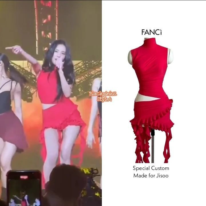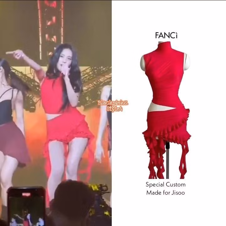 Trước đó, trong các buổi diễn Born Pink ở các nước khác thì BLACKPINK cũng có diện đồ của một thương hiệu thời trang Việt vô cùng quen thuộc với nhóm: FANCÌ. Đây chính là bộ váy đỏ rực rỡ được thiết kế riêng cho Jisoo.