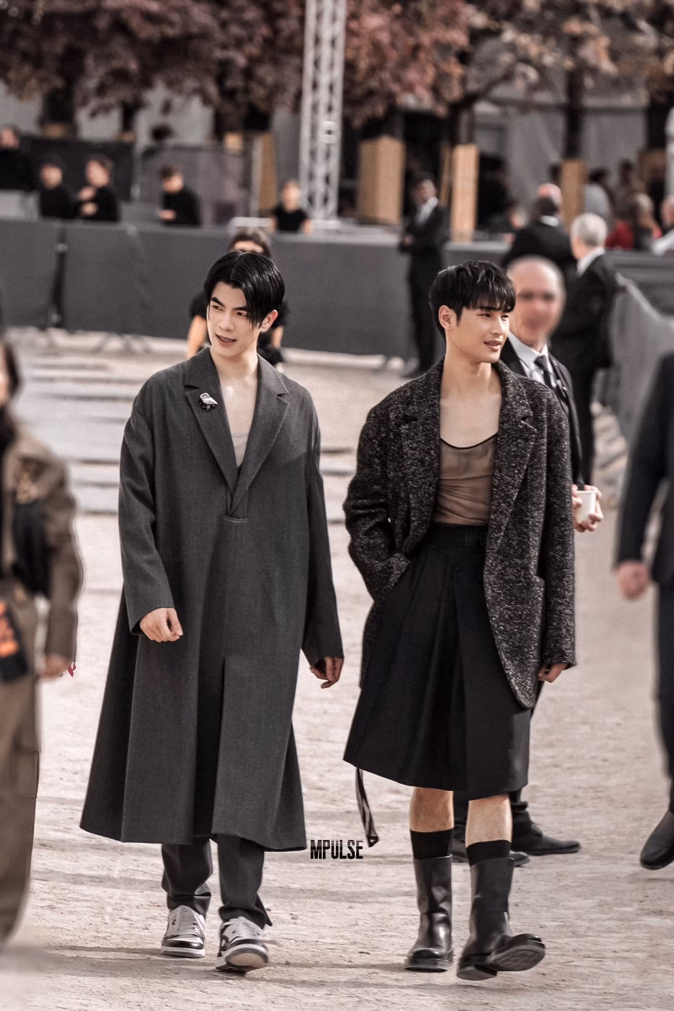 Đại sứ Dior tại Thái Lan, cặp đôi diễn viên Mile Phakphum và Apo Nattawin tham gia show diễn của nhà mốt trong trang phục tông màu xám, đen.