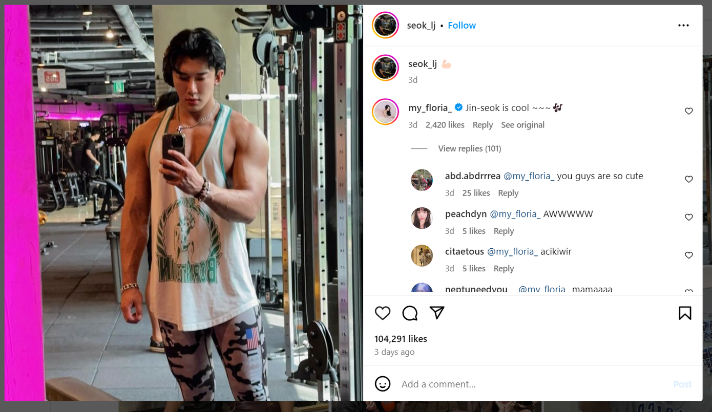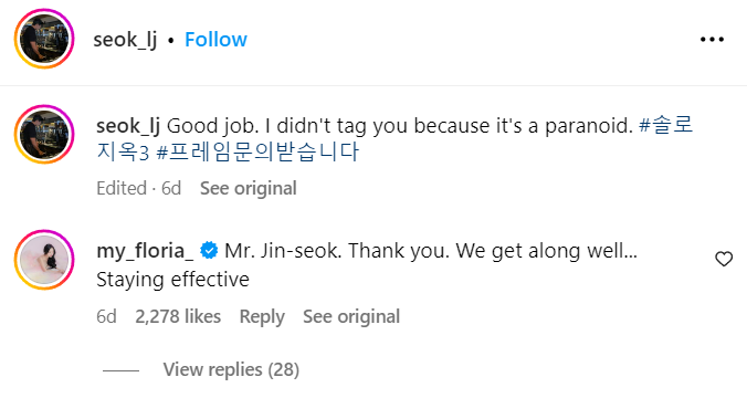 Gần đây, Jin Seok tham gia một buổi phỏng vấn. Trong video dài hơn 6 phút, mỹ nam Single’s Inferno chia sẻ nhiều thông tin cá nhân cũng như cảm xúc, đánh giá về các thí sinh trong show hẹn hò. Khi được hỏi liệu anh có đang hẹn hò với Min Young, phía nhà trai chia sẻ về tình trạng hiện tại của cặp đôi. “Không, chúng tôi duy trì mối quan hệ tốt với tư cách là bạn bè thân thiết.” - Jin Seok nói.