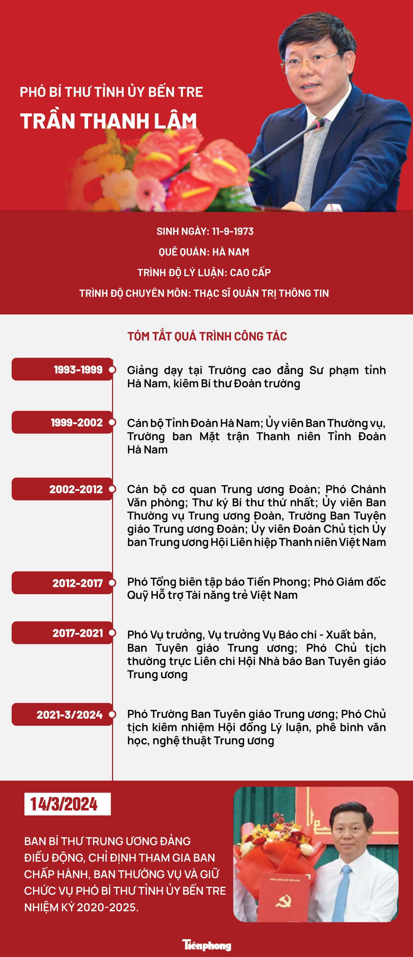 Theo Trưởng Ban Tuyên giáo Trung ương, Tân Phó Bí thư Tỉnh ủy Bến Tre Trần Thanh Lâm là cán bộ được đào tạo cơ bản, trải qua nhiều vị trí công tác. Với kiến thức chuyên môn sâu và am hiểu tình hình chính trị, kinh tế, xã hội đất nước, trên cơ sở nắm chắc lý luận và kinh nghiệm thực tiễn, trải qua nhiều cương vị ở nhiều môi trường khác nhau.