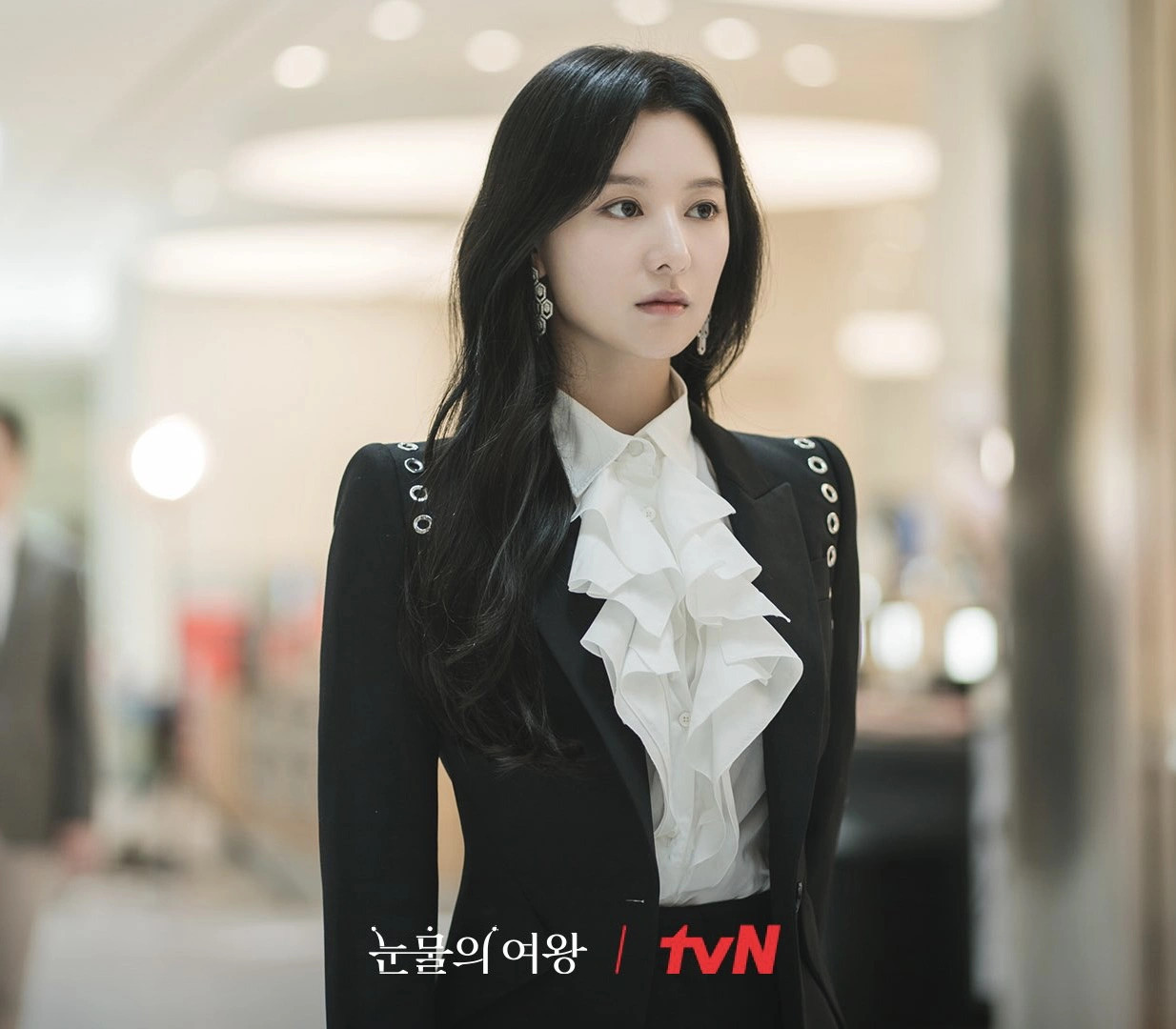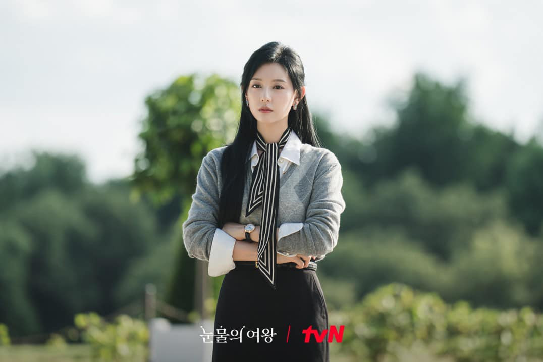 Hong Hae In trong Queen of Tears ghi điểm hoàn toàn ở phần này. Các trang phục với form dáng cứng cáp, vừa vặn giúp nữ chính thăng hạng nhan sắc. Ji Won khí chất ngời ngời trong các bộ âu phục, dù là thân phận thực tập sinh hay nữ tổng tài.