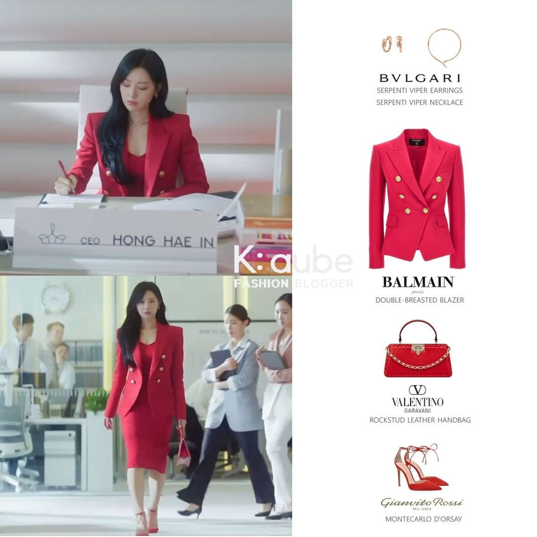 Trong những tập gần đây, sau khi Hae In phát hiện ra mong muốn ly hôn của Baek Hyun Woo, nữ CEO gây choáng khi diện sắc đỏ rực rỡ. Trang sức BVLGARI vàng gold hình rắn cũng được cho là ẩn ý về sự phẫn nộ của nữ chính.