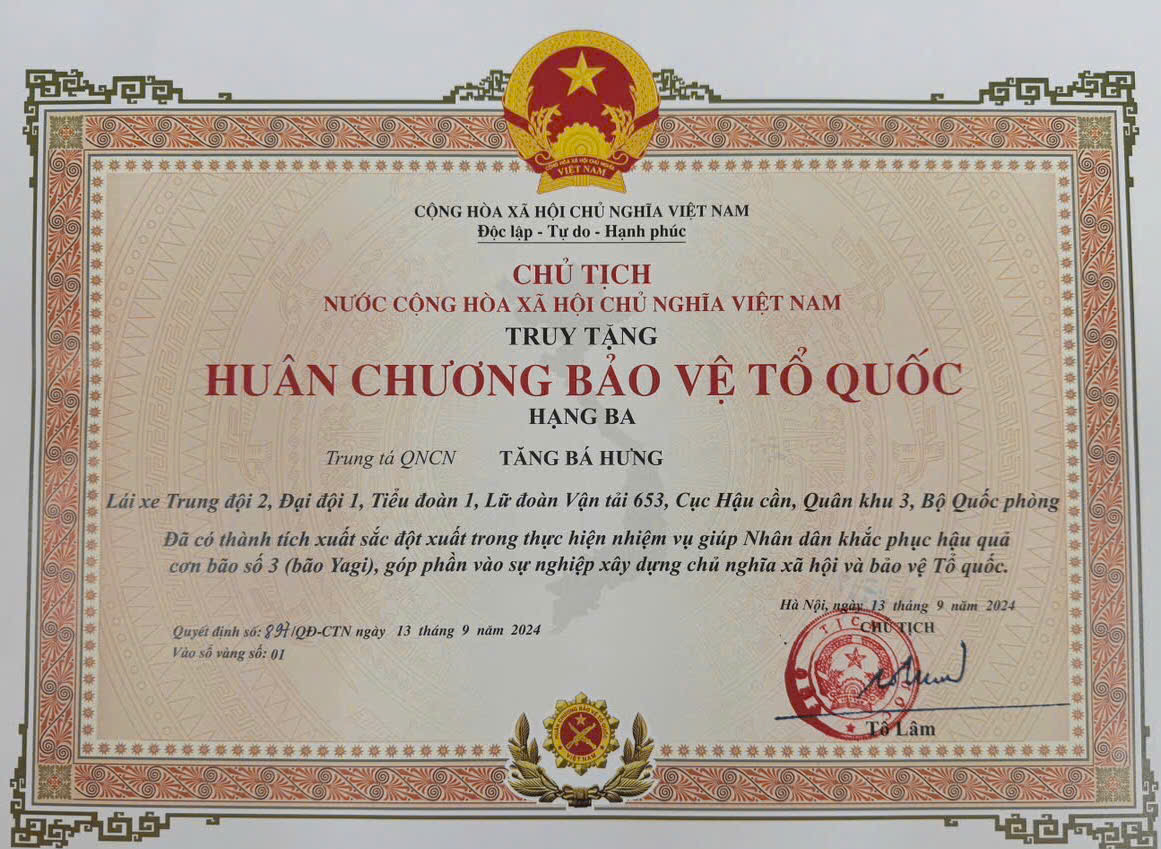 Theo Bộ Quốc phòng, vào hồi 13 giờ 30 phút ngày 11/9/2024, chấp hành mệnh lệnh của cấp trên, Trung tá quân nhân chuyên nghiệp Tăng Bá Hưng cùng đồng đội giúp nhân dân thị trấn Trường Sơn, huyện An Lão, thành phố Hải Phòng khắc phục hậu quả cơn bão số 3.