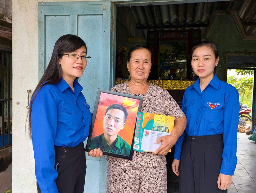 | Chị Trần Thị Hòa Xuân - Phó Bí thư Tỉnh Đoàn, Chủ tịch Hội đồng Đội tỉnh Bình Thuận đến nhà trao tặng bức ảnh phục dựng của các anh hùng liệt sĩ cho gia đình. |